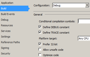 پروژه های #C در ویژوال استودیو به صورت پیش فرض دو تنظیم مختلف برای اجرا دارن. تنظیم Debug از سوییچهای -optimize/ و debug:full/ استفاده میکنه و تنظیم Release از سوییچهای +optimize/ و debug:pdbonly/. تو تصاویر زیر این موارد نشون داده شدن: