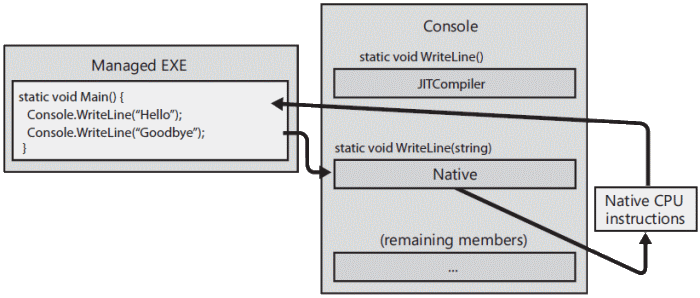 تو مثال جاری، این متد تنها یه ریفرنس به یه نوع داره، کلاس System.Console، که باعث میشه CLR یه ساختار داخلی تنها برای همین به ریفرنس تولید کنه. این ساختار داده ای برای هر متد تعریف شده تو کلاس Console یه ورودی داره. هر کدوم از این ورودیها آدرس پیاده سازی متد مربوطه رو نگه میداره.