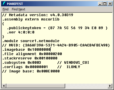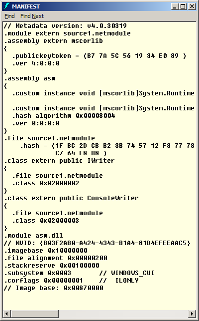 با کمال تعجب مشاهده میشه که یه بخش به نام «M A N I F E S T» وجود داره. درصورتیکه با توجه به مطالب ارائه شده تا اینجا، نباید چیزی به نام مانیفست برای ماژول های مدیریت شده که بخشی از یه اسمبلی کامل هستن تولید بشه. برای بررسی بیشتر، محتوای این قسمت (که با دابل کلیک روی MANIFEST نشون داده میشه) تو تصویر زیر آورده شده: