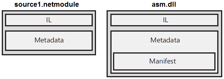 این دستور به کامپایلر #C میگه که یه اسمبلی کتابخونه ای به نام asm.dll با کامپایل سورس کد source2.cs تولید کن. این فایل نهایی علاوه بر متادیتا، حاوی داده های مانیفست هم خواهد بود. همچنین سوییچ addmodule:source1.netmodule/ مشخص میکنه که ماژول source1 هم به عنوان بخشی از اسمبلی باید تو تولید فایل نهایی درنظر گرفته بشه. بنابراین تو مانیفست تولیدی این مورد دخالت داده میشه. درواقع تو جدول FileDef این مانیفست، یه رکورد برای این ماژول درج میشه. درضمن تمامی نوع های عمومی تعریف شده تو این ماژول تو جدول ExportedTypesDef ثبت میشن.