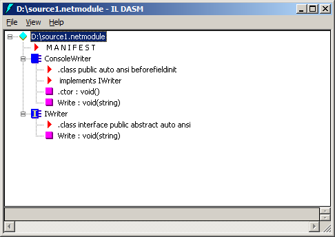 با اجرای این دستور، کامپایلر #C یه فایل به نام source1.netmodule تولید میکنه. این فایل یه dll استاندارد به همراه داده های متادیتای بدون مانیفسته. بنابراین CLR امکان بارگذاری اون رو بصورت مجزا و به تنهایی نداره. برای کنجکاوی بیشتر این ماژول رو با استفاده از ابزار ILDasm.exe بررسی میکنیم. نتیجه چیزی شبیه تصویر زیره: