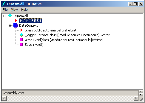 برای بررسی این اسمبلی تولید شده، محتوای اون رو با استفاده از ابزار ILDasm.exe مشاهده میکنیم که نتیجه تو تصویر زیر آورده شده: