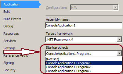 تو این قسمت تمامی کلاسهایی که حاوی متد Main مناسب هستن، لیست میشن. مثلا تو این تصویر نشون میده که سه کلاس مختلف امکان تنظیم برای نقطه ورودی رو دارن.
