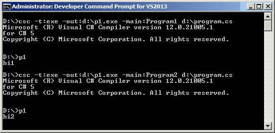 Program1.cs(10,15): error CS0017: Program 'd:\p1.exe' has more than one entry point defined: 'Program2.Main()'. Compile with /main to specify the type that contains the entry point.