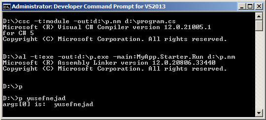 با اجرای این دستور یه ماژول مدیریت شده تو ریشه درایو :d تولید میشه. برای تولید یه اسمبلی اجرایی از این ماژول مدیریت شده (p.netmodule) با استفاده از AL.exe باید از دستور زیر استفاده کرد. به روش معرفی یه نقطه ورودی با استفاده از سوییچ main/ تو این دستور دقت کنین: