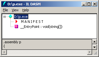 با اینکار درواقع یه اسمبلی دو فایله تولید میشه که فایل اصلی این اسمبلی (d:\p.exe) حاوی اطلاعات جداول مانیفست اسمبلیه. علاوه بر این جداول، یه متد گلوبال کوچیک به نام EntryPoint__ هم به فایل اصلی اسمبلی اضافه میشه. این متد بخاطر استفاده از سوییچ main/ توسط ابزار AL.exe تولید شده. بهتره برای روشنتر شده مطلب، فایل p.exe با استفاده از ابزار ildasm.exe مورد بررسی قرار داده بشه: