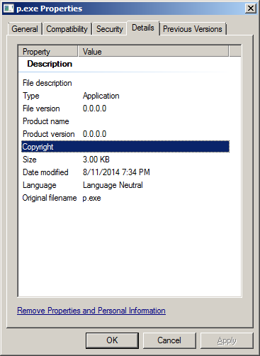 برای مشاهده خلاصه ای از این داده ها میشه از پنجره پراپرتی های فایل کمک گرفت. تو ویندوز ویستا به بعد، این داده ها تو تب Details نشون داده میشه. مثلا پنجره پراپرتی های فایل PE مثال مطلب قبلی (p.exe) تو تصویر زیر نشون داده شده: