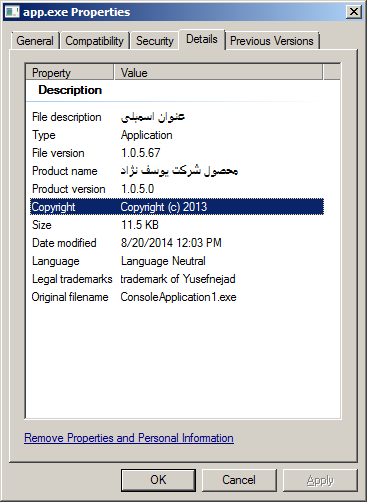 using System.Reflection; // FileDescription version information: [assembly: AssemblyTitle("عنوان اسمبلی")] // Comments version information: [assembly: AssemblyDescription("شرح عملکرد اسمبلی")] // CompanyName version information: [assembly: AssemblyCompany("شرکت یوسف نژاد")] // ProductName version information: [assembly: AssemblyProduct("محصول شرکت یوسف نژاد")] // LegalCopyright version information: [assembly: AssemblyCopyright("Copyright (c) 2013")] // LegalTrademarks version information: [assembly: AssemblyTrademark("trademark of Yusefnejad")] // AssemblyVersion version information: [assembly: AssemblyVersion("1.0.5.0")] // FILEVERSION/FileVersion version information: [assembly: AssemblyFileVersion("1.0.5.67")] // PRODUCTVERSION/ProductVersion version information: [assembly: AssemblyInformationalVersion("1.0.5.0")] // Set the Language field (discussed later in the "Culture" section) [assembly: AssemblyCulture("")]
