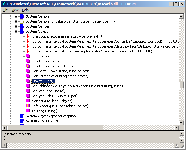 اما برای دیدن پیاده سازی این متد تو کلاس Object میشه از ابزار ildasm استفاده کرد. پس از باز کردن این برنامه با استفاده از خط فرمان ویژوال استودیو، برای مشاهده کدهای IL کلاس object، فایل mscorlib.dll که این کلاس و بقیه انواع پایه ای دات توشه رو باید باز کرد: