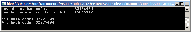 Console.WriteLine("new object hash code: \t\t{0}", new object().GetHashCode()); Console.WriteLine("another new object hash code: \t{0}", new object().GetHashCode()); Console.WriteLine("".PadLeft(50, '=')); var a = new object(); var b = a; Console.WriteLine("a's hash code: {0}", a.GetHashCode()); Console.WriteLine("b's hash code: {0}", b.GetHashCode());